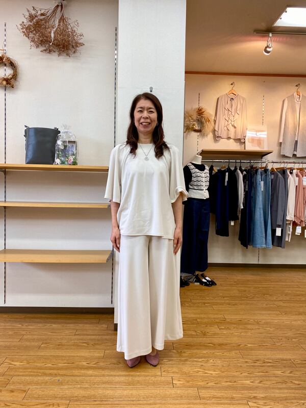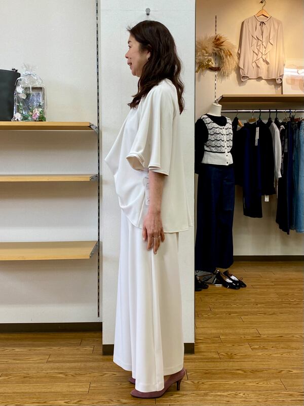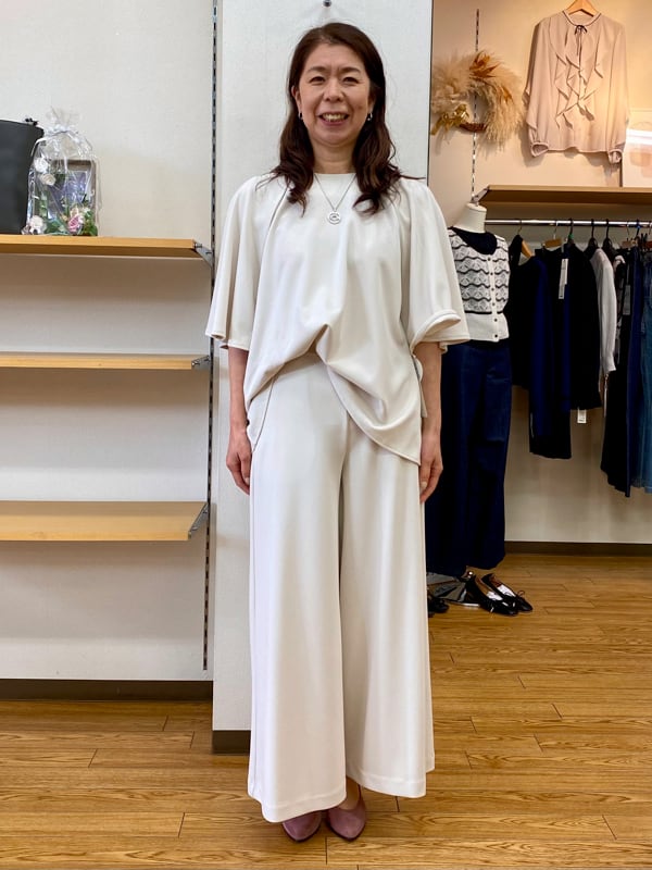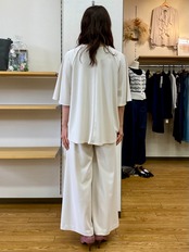 ハレの日にぴったりな、ワイドパンツスーツが登場しました。立体的なニットジョーゼット素材で仕立てられたトップスは、ふんわりとした袖がエレガントな印象を与えてくれます。ワイドパンツはリラックス感を演出しつつも、上品なスタイルで、特別な日のお出かけやパーティーにぴったりです。
